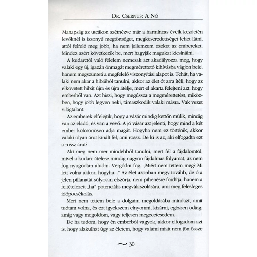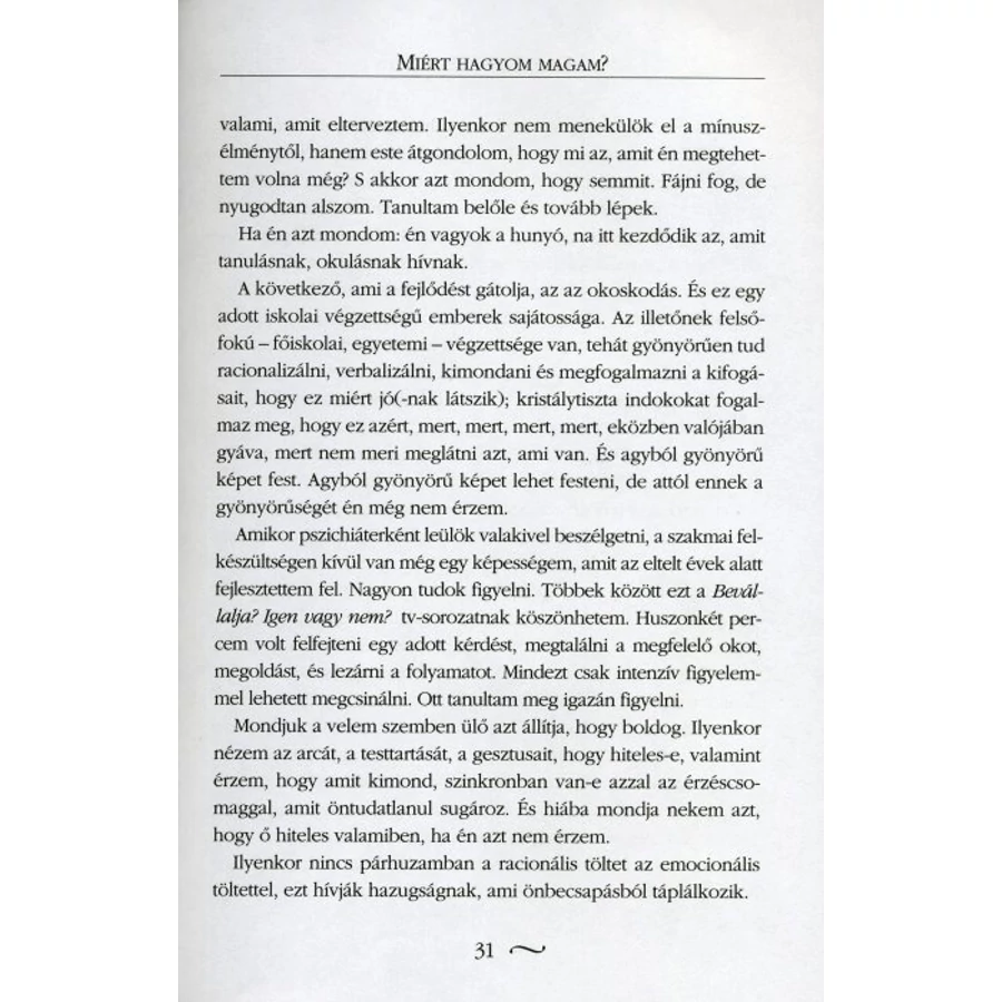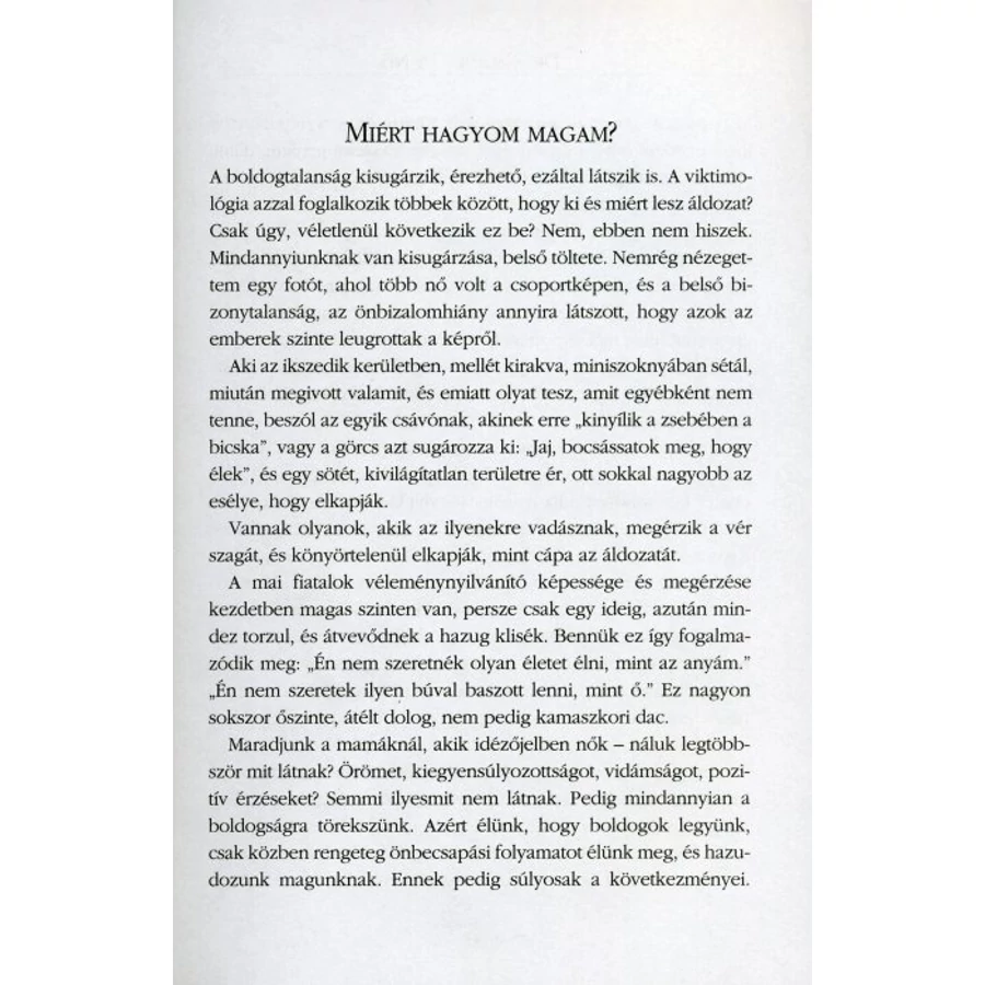 „Ami tény, a könyv elolvasása senkit sem fog jobb nővé tenni! Ezt felejtsük el! Kihangsúlyozom: az elolvasása. Az elolvasás lehet, hogy felhívja az emberek – legyenek akár nőneműek vagy hímnemek – figyelmét bizonyos dolgokra, folyamatokra, esetlegesen információtöbbletet ad. De azzal már illik valamit kezdeni a gyakorlatban is, az illető saját életében. Nagyon sok ember olvas el különböző önismereti figyelemfelhívó könyveket, s akkor azt gondolják, így sokkal több pénzt fognak keresni, meg sokkal jobb emberek lesznek. Sajnos, ez nem működik. Az elolvasott és felismert dolgok gyakorlati alkalmazása azt teljesen más.”